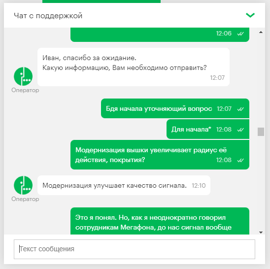 Я начал вялую пока переписку с Мегафоном через чат техподдержки. Я же их давний абонент, да и жену с МТС перевел на Мегафон с ее номером... Операторы давали стандартные отписки и туманные шаблонные обещания. Так прошло около полугода. Наконец, меня приперло, и я начал уже наезжать на них. Тогда один из операторов посоветовал воспользоваться опцией "качество связи" в личном кабинете. Я воспользовался и оправил запрос. Из-за плохой связи все эти переписки и манипуляции совершались в городе.