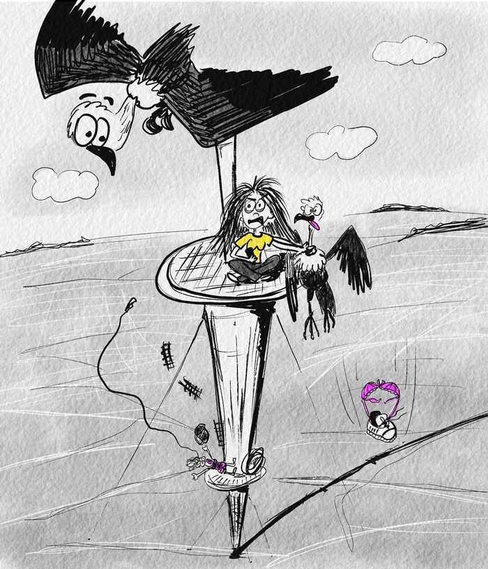 Плаксивая решается на план. Она быстренько доедает грифа, которого чуть раньше контратаковала и взяла на удушающий, собирается с силами, цепляет страховку, сползает по ней и прыгает на антенны. Там она достает телефон, печатает сообщение, кладет телефон в кед, а кед для мягкости засовывает Оторве прямо в ж...