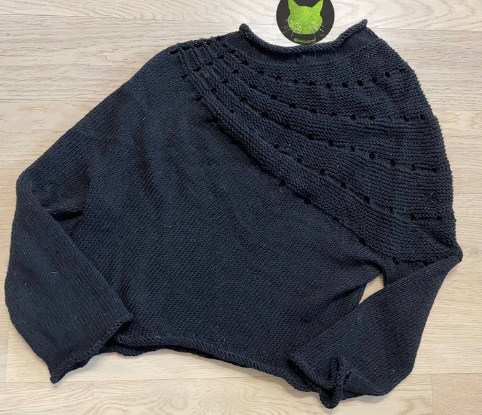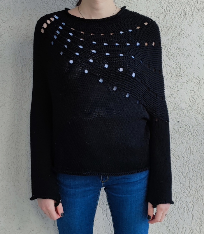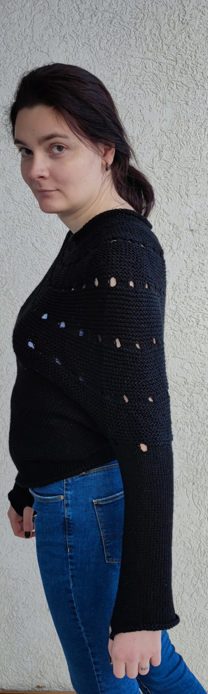 Джемпер связан снизу вверх. Плечи прямые, без скосов. Джемпер без анатомических пройм. Рукава прямые. Снизу, на теле изделия, резинка 1 на 1, итальянским набором. На рукавах полая резинка. Петли для горловины подняты с обеих сторон, реальная кетлёвка.