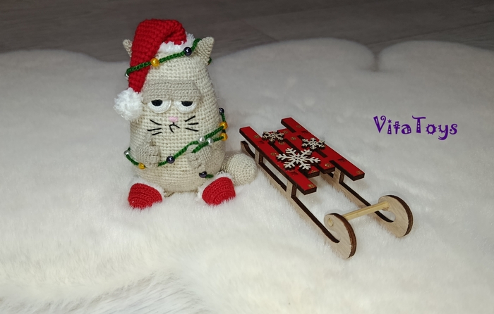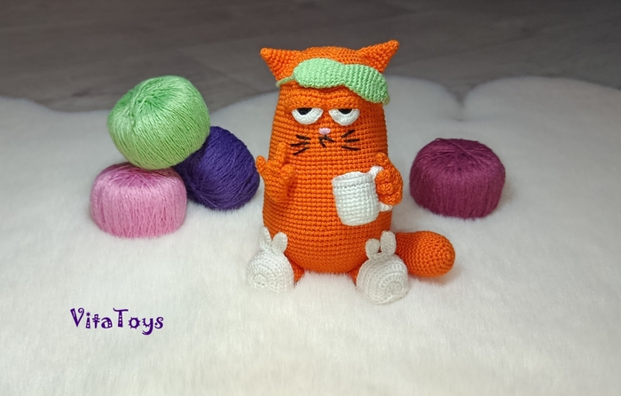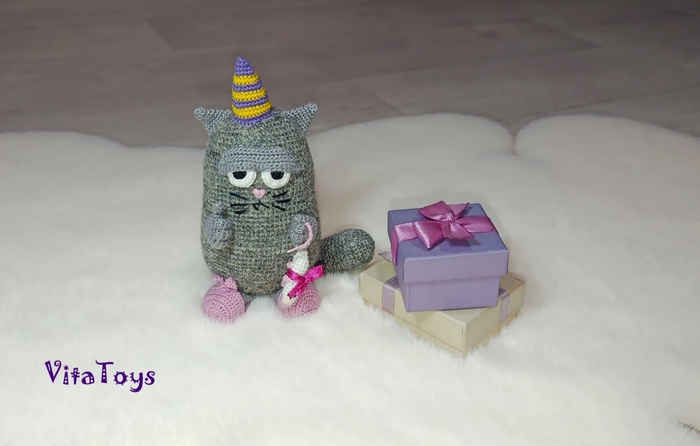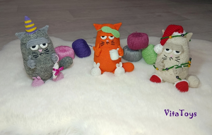 Утреннего кота я уже вязала, связала ещё одного и решила что можно и с тематикой поиграться. Так родилось ещё два варианта котиков: кот Новогодний и кот Денрожденный.