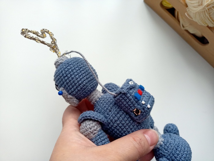 у него подвижны ноги, руки и пальцы. Глаза разного размера и один глаз с красной радужкой, немного отсылка к терминатору
