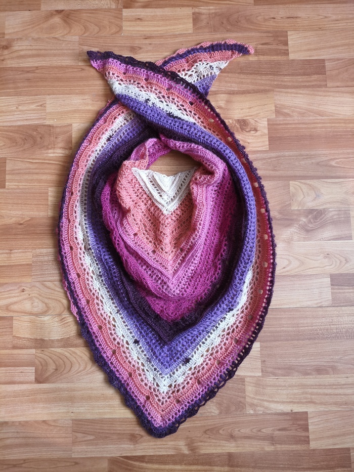 Из-за морозов озадачилась новым тёплым бактусом. Задача была сделать его тоньше, чем имеющийся зимний, чтобы хорошо драпировался под курткой (тот, что ношу сейчас - объёмный очень). Поэтому выбрала Nako Angora Luks Color (810м/150гр, 80% премиальный акрил/15% шерсть, 5% мохер), крюк 2,75.