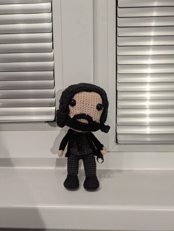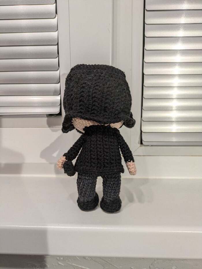Я с этой вселенной не была знакома, поэтому мне подсказали, что главный атрибут Алана это фонарь. Аккуратно связала крошечный фонарик и пришила к руке.