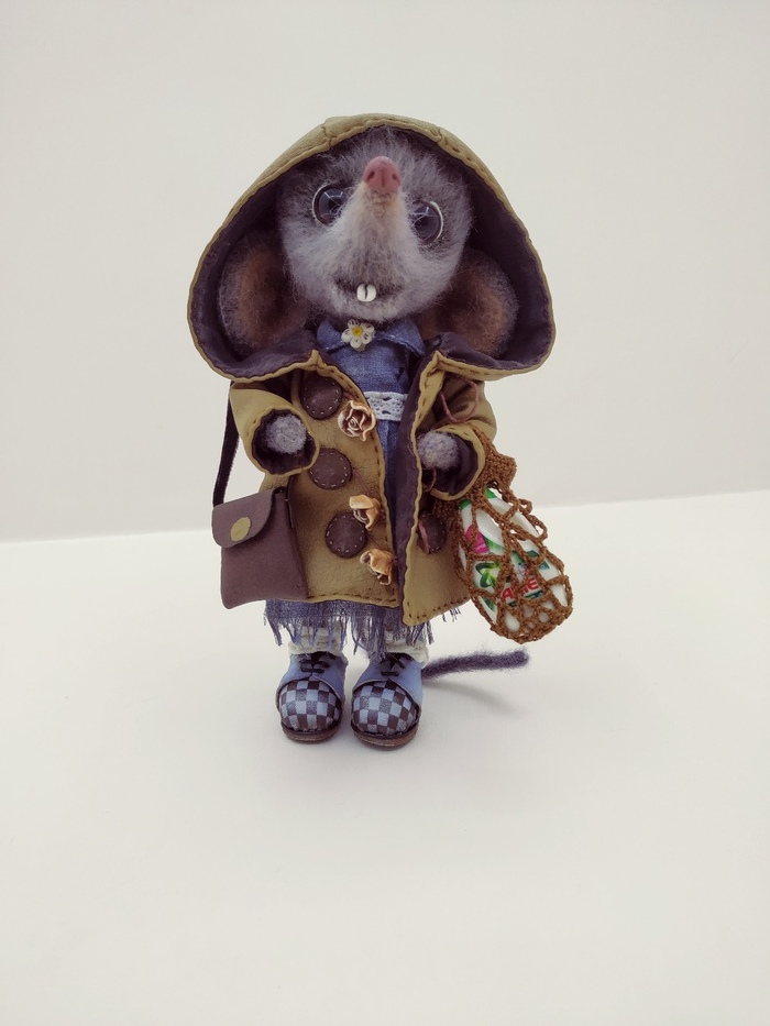 Связана из кид мохера в три нити) 16см в высоту)) полностью на проволочном каркасе, хвост выступает в качестве опоры) стоит сама) нос, зубы - полимерная глина) ботинки, сумочка, пальто - кож.зам) одежда сшита вручную)) вся одежда снимается - кроме ботов 😁 Пы.Сы. А, да забыла) Тонировка масляными красками.