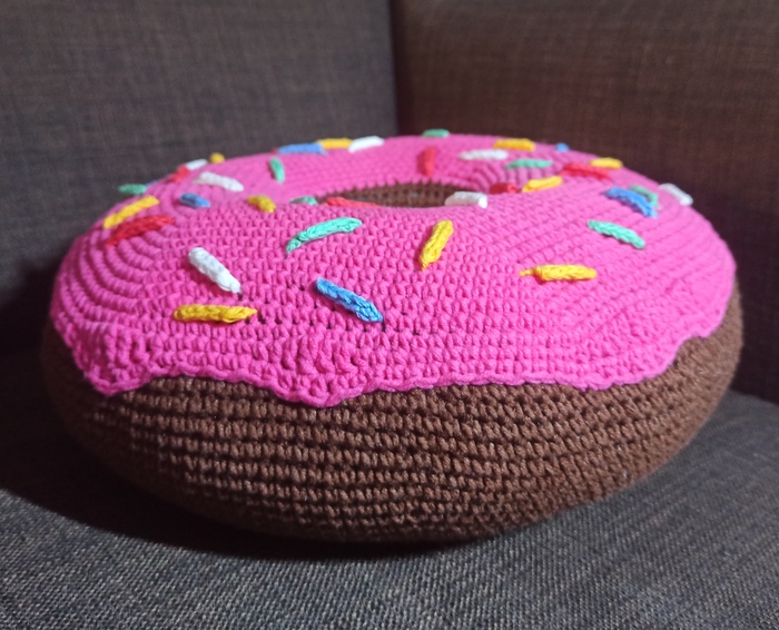 Очередной заказ от моего парня: связать декоративную подушку-пончик Гомера Симпсона. Вот что получилось.