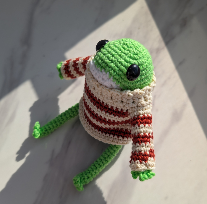 Сделан в смешанной технике из микровелюровой пряжи и полимерной глины, имеет каркас.