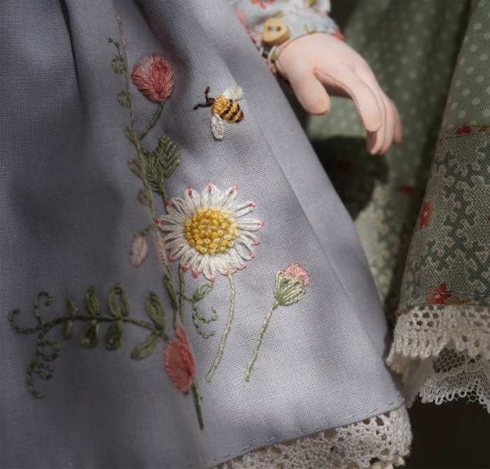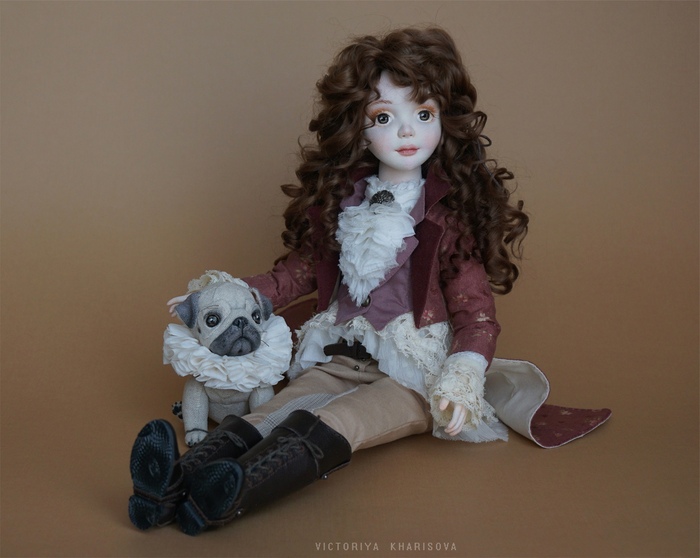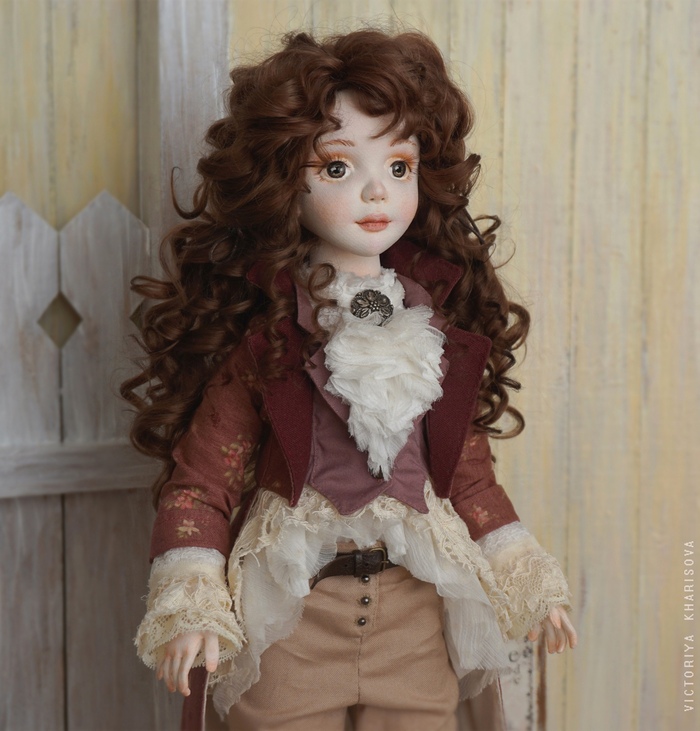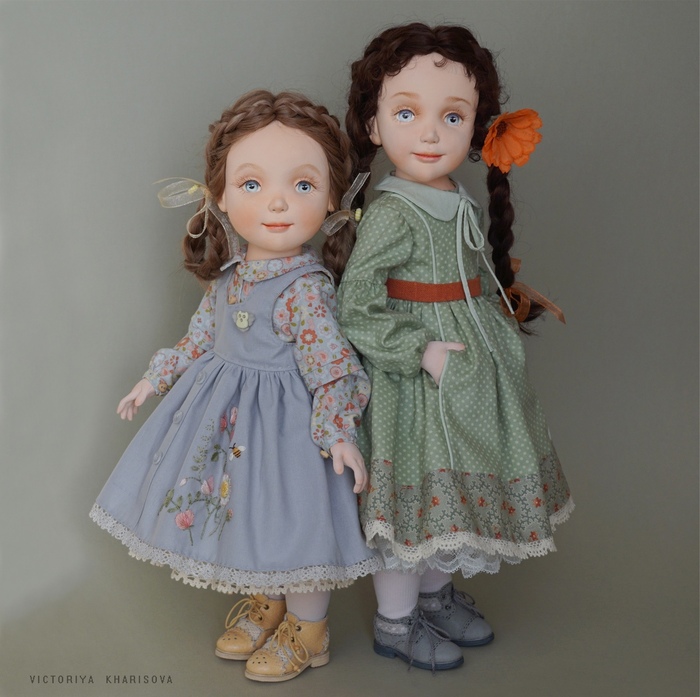 Куклы выполнены в технике "грунтованный текстиль". Голова и шея покрыты акрилом и матовым лаком с уф защитой, супер-клир, поверхность получается матовая и бархатистая. В шее и кистях рук проволока, пальчики сгибаются. Одежда и обувь съемные.