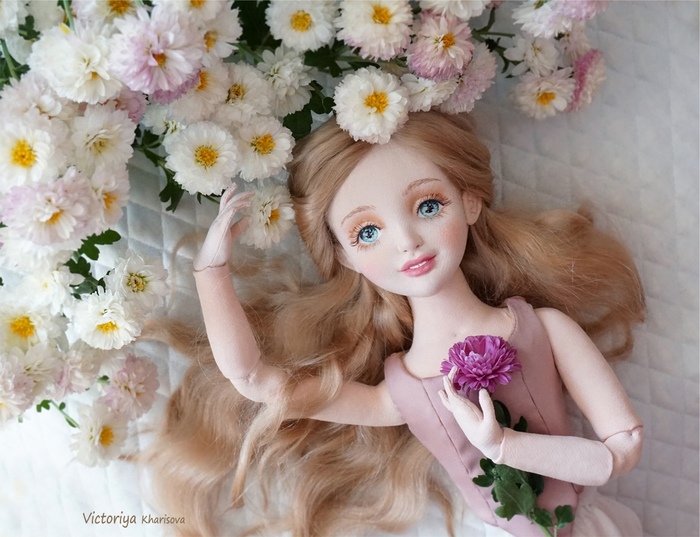 Моя авторская ручная работа, Варвара Краса) текстильная шарнирная кукла. С этой куклой наэкспериментировалась. Голову, шею и ноги покрыла грунтом, матовыми акриловыми красками и лаком - клир с уф защитой. Рост 45 см. Кукла плотно набита синтепоном, на вес тяжелая. Шарниры деревянные бусины. В кистях рук и шее есть проволочный каркас, пальчики сгибаются. Голова поворачивается и немного наклоняется. Волосы сделаны из козьего пуха, они покрашены и напитаны бальзамом, поэтому имеют приятный аромат.