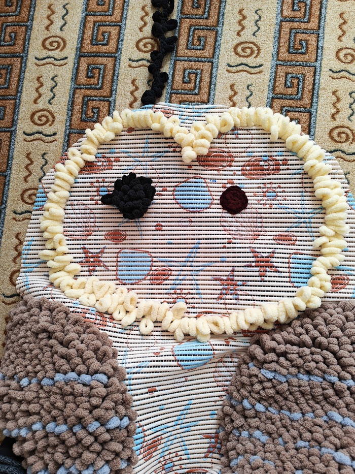 Накидав не хитрый набросок и перенеся его на уже обрезанный по форме совушки ковер я по-тихонечку начала вытягивать петельки. Самое сложное было соблюсти симметрию и изобразить мордочку. Для создания глаз в начале пыталась использовать плюшевую пряжу, которая вплелась в ковер довольно плоско. Но эффект глубины глаз меня не впечатлил и я решила всё же весь ковер сотворить из петельчатой пряжи: