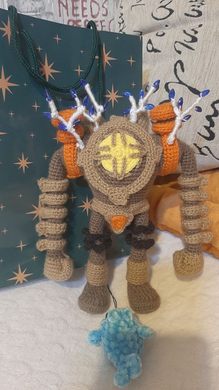 У меня снова заказали игрушку и безумно счастлива. На этот раз это персонаж из игры Genshin Impact - Страж руин. Вязала игрушку 3 недели, процесс был довольно сложным , но очень интересным. Вязала из акриловой пряжи, на проволочном каркасе, руки и ноги двигаются и сгибаются.