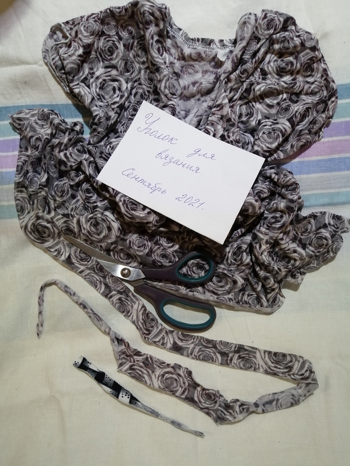 Для вязания я использовала полоски трикотажной ткани, которые я нарезала по спирали. Использовала для этого старые футболки, юбки, платья. На фото футболка которую я режу полоской, при натяжении эта полоска скручивается и становится довольно прочной нитью, обычно она закручивается лицевой стороной внутрь, поэтому нитки не очень яркие.