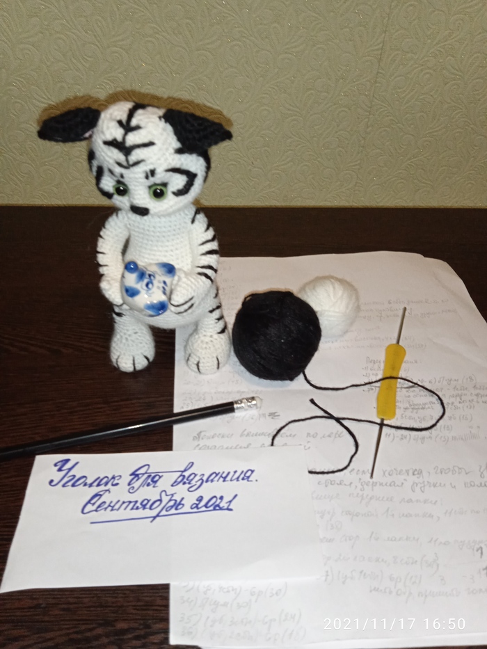 Пряжа: Детская новинка, черная и белая, немного розовых ниточек "Ирис" и пряжа "Снежинка" для пришивания глазок. Крючок 1,3. Каркас из медной проволоки, благодаря которому он не только самостоятельно стоит (не без помощи хвостика), но и может держать различные предметы. Детали, кроме ушек, связаны белой пряжей, а полоски уже вышиты в процессе вязания.