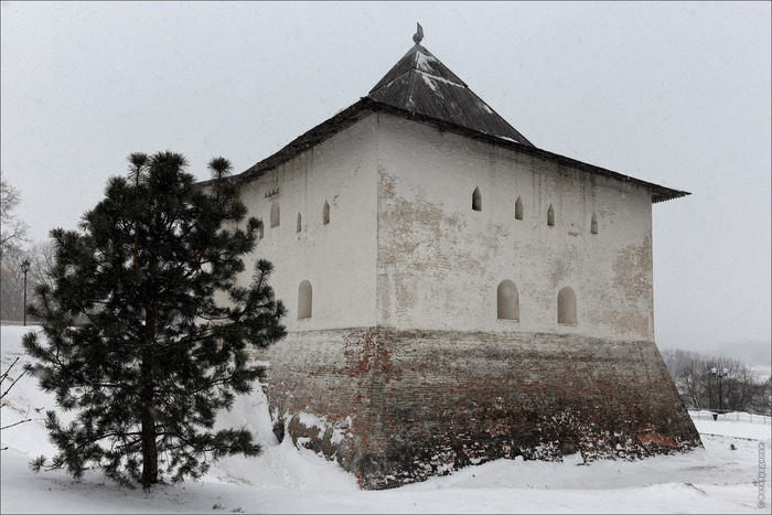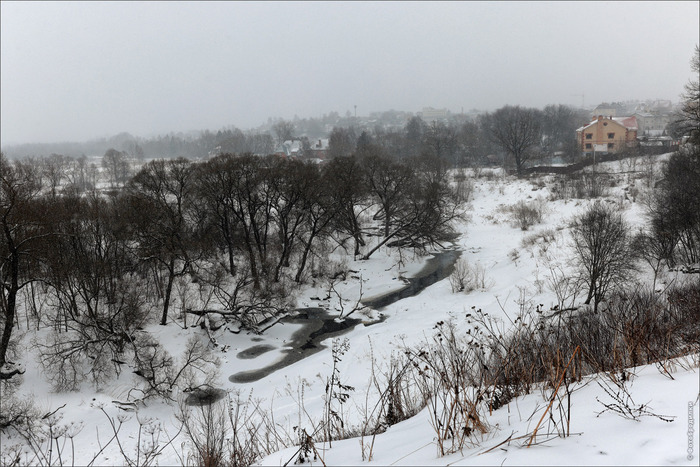 На снимке типичный провинциальный уездный город начала прошлого века. Каменные и деревянные дома, храмы, извилистые улочки, уходящие вдаль. Всё это с высоты птичьего полёта с колокольни Троицкого собора, одной из главных достопримечательностей Вязьмы.
