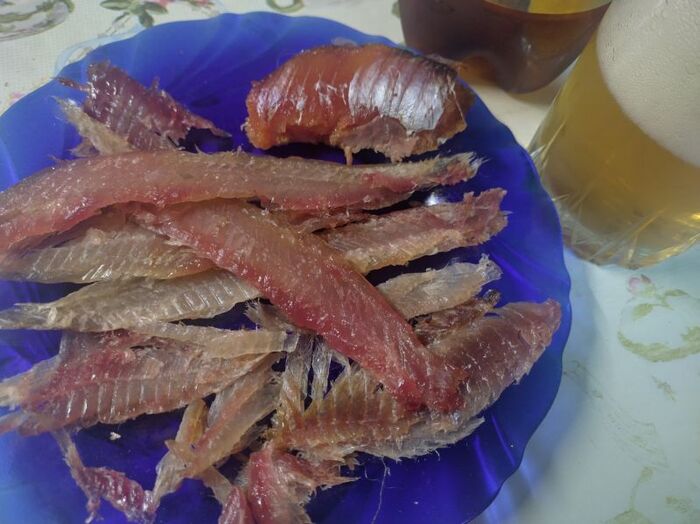 ...а всё потому,что дождь. Не было бы дождя, шашлык бы откушивал любуясь заходящим солнышком. Но раз дождь, то и простая вялено-солёная рыбка и пенный напиток легко скрасит вечер.