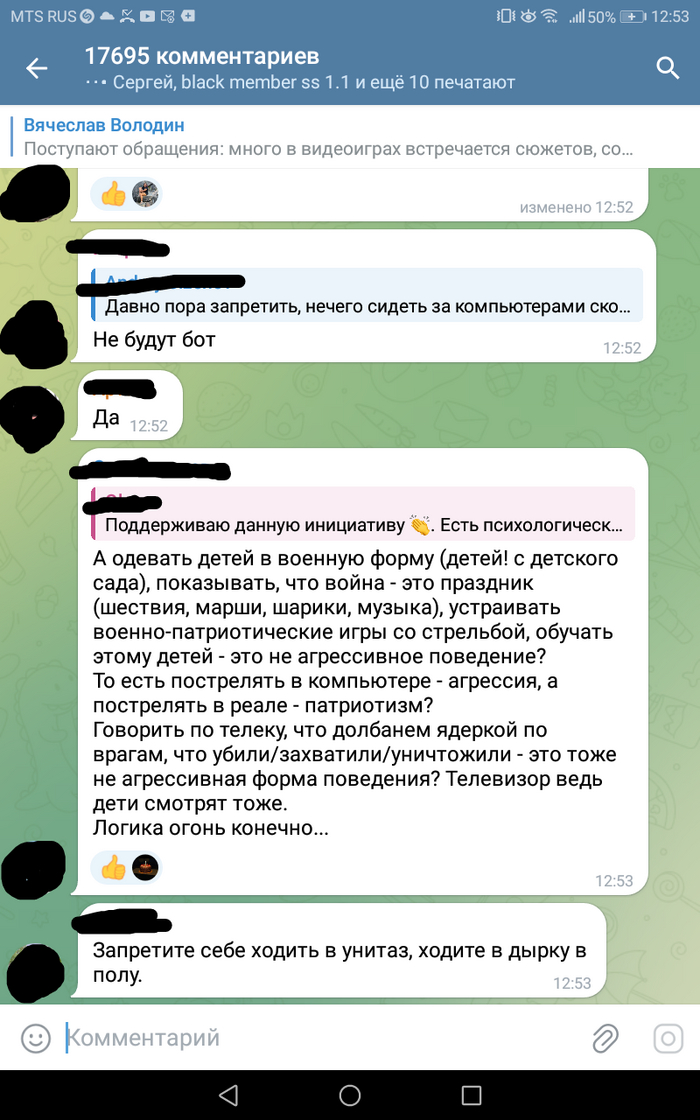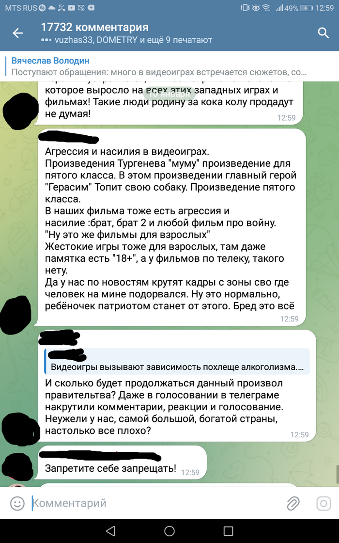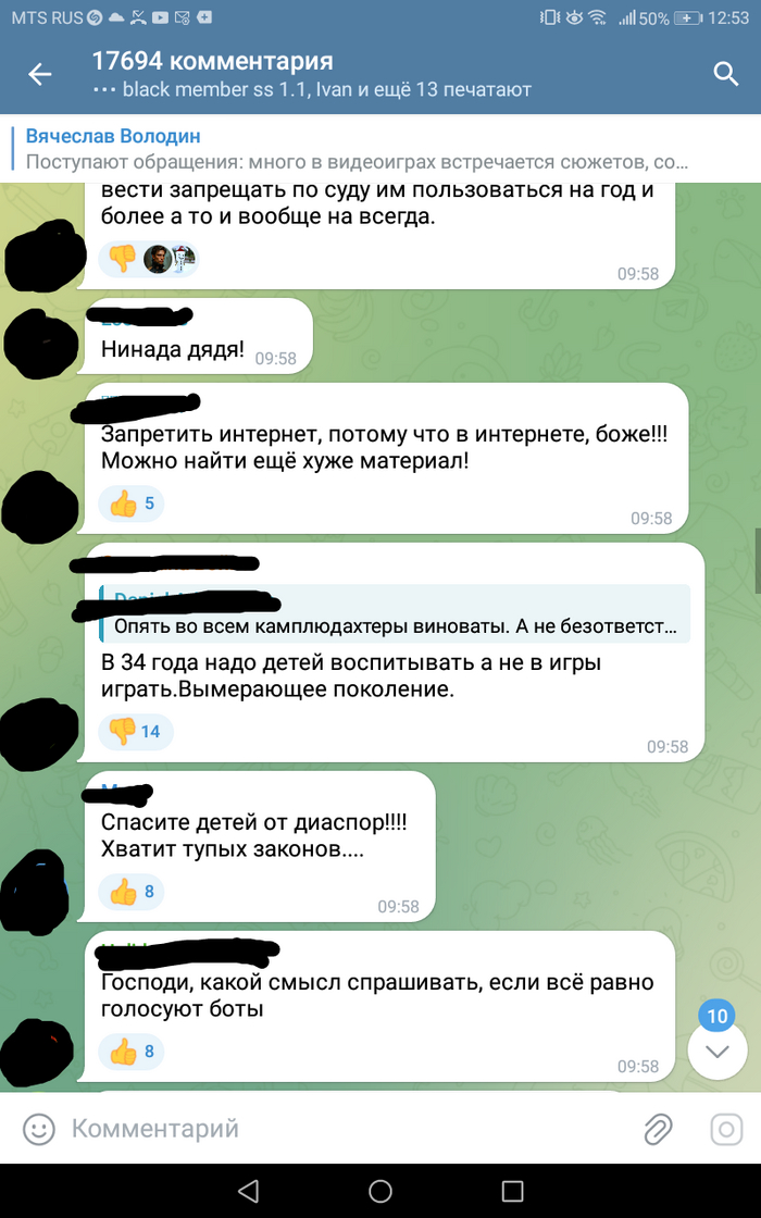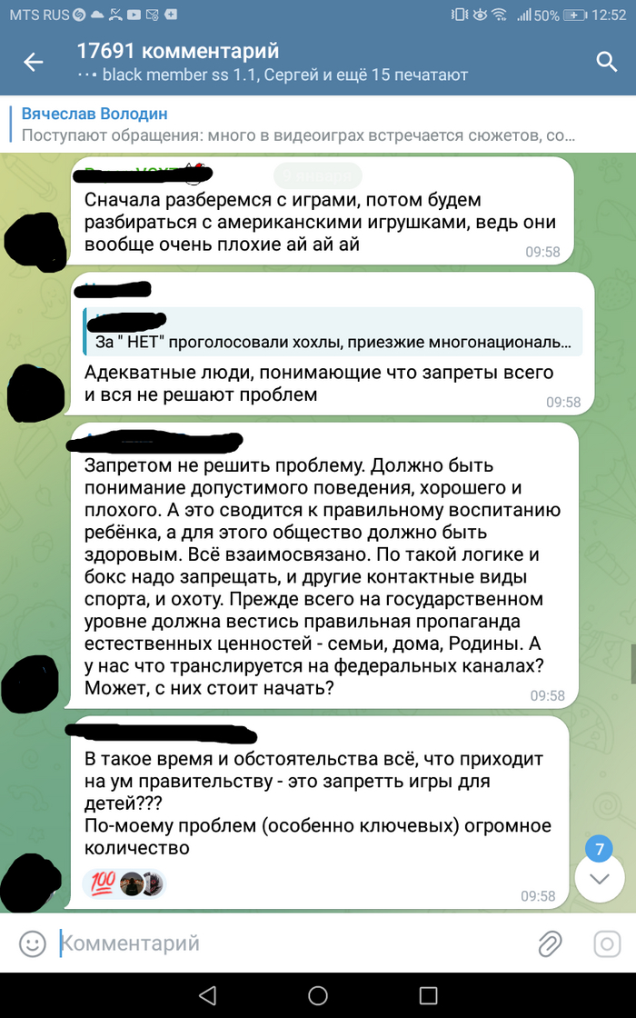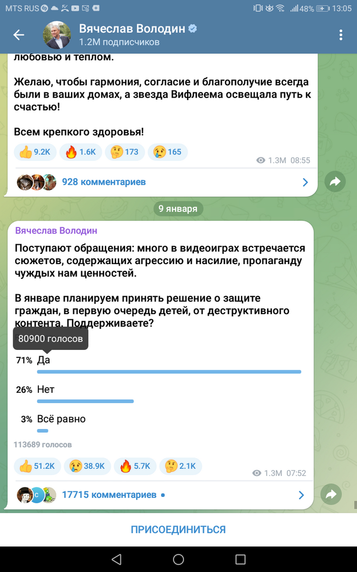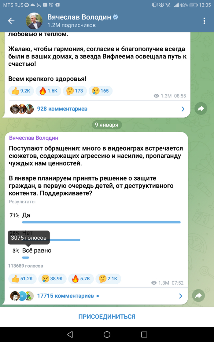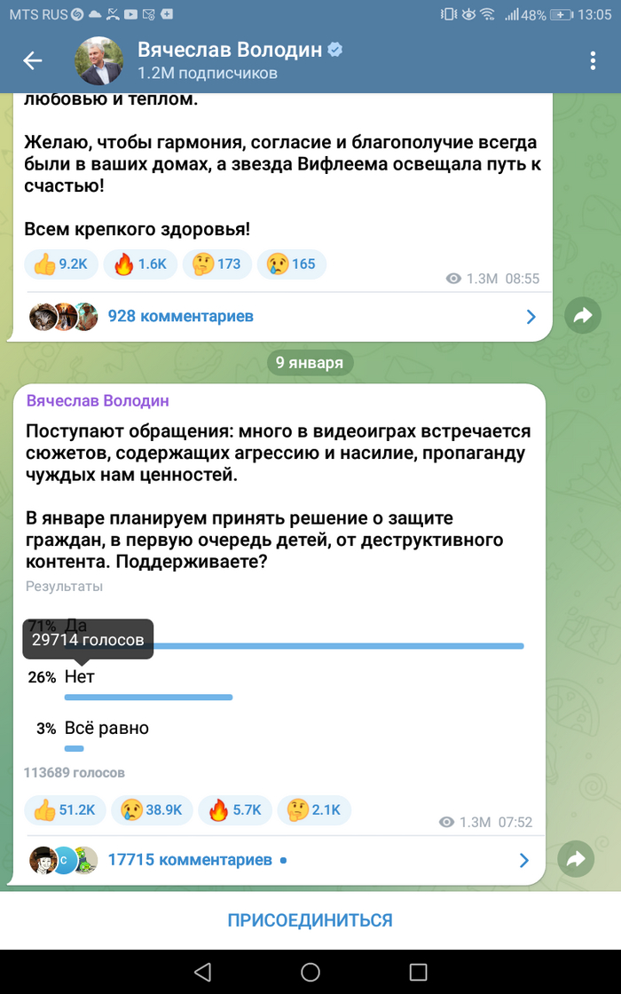 Спикер Госдумы Вячеслав Володин 9 января сообщил, что до конца месяца будет рассмотрен вопрос о защите граждан от деструктивного контента. Он отметил, что "поступают обращения: много в видеоиграх встречается сюжетов, содержащих агрессию и насилие, пропаганду чуждых нам ценностей".