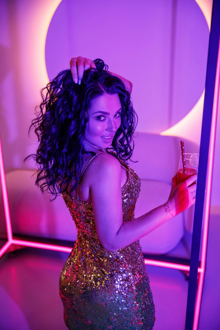 Меня заинтересовало ее диско платье в золото-зеленых пайетках. Прокрашивала его вручную акриловыми красками.
