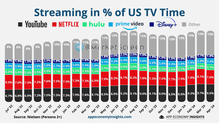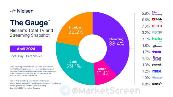 По результатам апреля 2023 нарисовалась следующая картина. 38,4% поглощают телевизионный контент через стриминговые сервисы, среди которых лидируют с большим отрывом Ютабчик и Нетфликс с 9,6 и 7,6% соответственно.