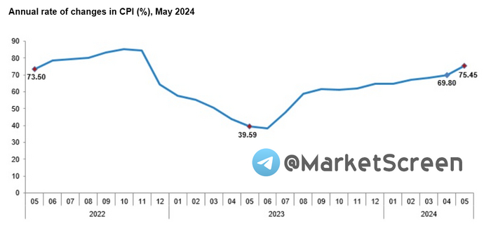 В мае годовая инфляция составила 75,45%. Месячная - 3,37%.