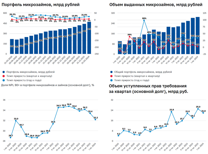 ▪️ Выдачи физикам выросли на 5,5%, МСП упали на 21%. ▪️ Совокупный портфель - 472 млрд ₽ (+7% за квартал) ▪️ Доля просрочки (NPL 90+) снизилась до 32% ▪️ 80% общего объема выдано онлайн ▪️ Объемы уступленных прав требования имеют повышательную тенденцию. С 4,1 млрд ₽ в 1 кв.2020 до 21,8 млрд ₽ в 1 кв.2024. ▪️ Доля займов с ПДН > 80% в совокупном объёме выданных займов составила около 15% — немногим больше, чем в IV квартале 2023 года. Для сравнения: в I квартале 2023 года значение показателя составляло 30%.