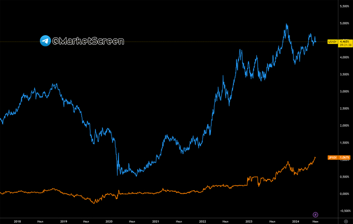 В частности, 10-летки. Сейчас они на уровне 2011 года. Но мы тут вот о чём подумали. Япония владеет казначейскими облигациями США на сумму 1,2 трлн $. Если нам не изменяет память, они самые крупные держатели этих долговых бумажек. А теперь представим, что доходность японских 10-леток становится выше доходности американских 10-леток. М?