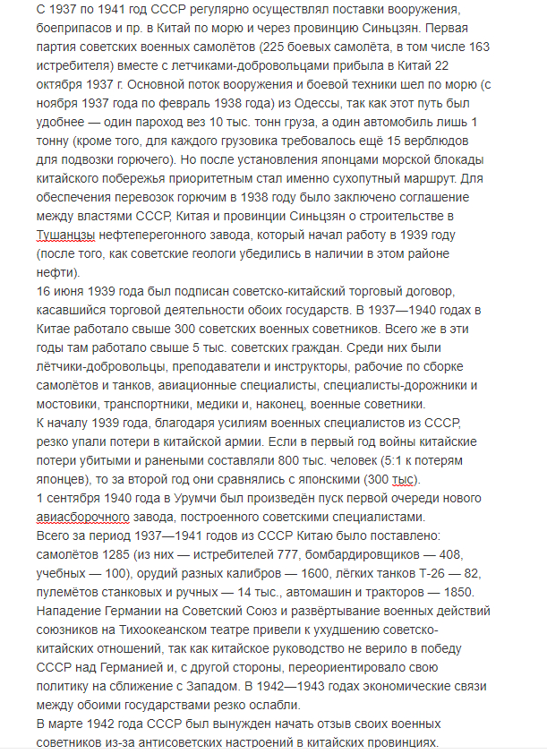В августе 1937 был подписан договор о ненападении между Китаем и СССР, а нанкинское правительство обратилось к последнему с просьбой о материальной помощи. 1 марта 1938 года было подписано советско-китайское соглашение, согласно которому СССР предоставлял Китаю кредит в 50 млн на приобретение советских товаров, а также на их доставку до китайской территории, причем кредит и проценты по нему должны были быть погашены поставками китайских товаров. 13 июня 1939 года было заключено двустороннее соглашение о новом советском кредите Китаю в размере 150 млн сроком на 10 лет.