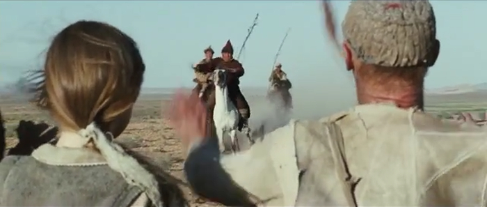 Тут внезапно беглецов догоняют дикие монголы, с которыми американец идет на контакт. Монголы, узнав что они разговаривают с культурным американцем, который с дочерью направляется в Тибет, беглецов не трогают и скачут себе дальше.