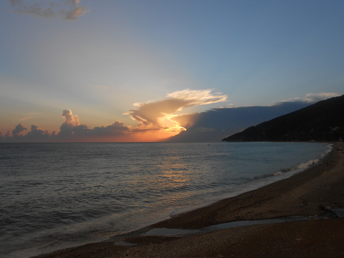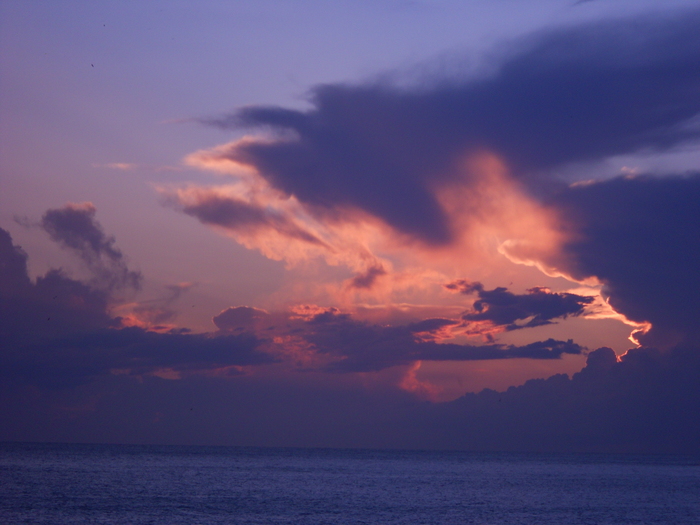 Ну так вот. Гроза бушевала, я сидела в плетеном кресле, завернувшись в плед, и наблюдала картину битвы природы с самой собой. Вода из неба лилась потоком, шум верта переходил в рев, вокруг было темно как ночью. Потом все закончилось так же стремительно, как и началось. Грозовой фронт ушел в Адлер, а я (а также и все остальные зрители, включая хозяина кафе!) с открытыми ртами снимали метаморфозы моря и неба на телефоны.