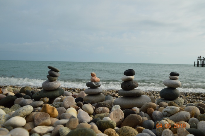 И моё увлечение на пляже! Отдыхала на майских праздниках в 2019 году. Было тепло, но поплавать смогла только в один день, море ещё не прогрелось. А так как дышать морским воздухом полезно, да и просто здорово, то на пляже я разлекалась выстраивая камешки! А потом устроила им фотосессию!