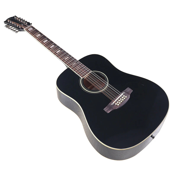 Гитара с двенадцатью струнами формирует насыщенное и объёмное звучание, создавая плотный акустический фон и выразительные аккорды. Парное расположение струн усиливает резонанс и добавляет глубину тембру, что особенно заметно при аккомпанементе и игре открытых аккордов.