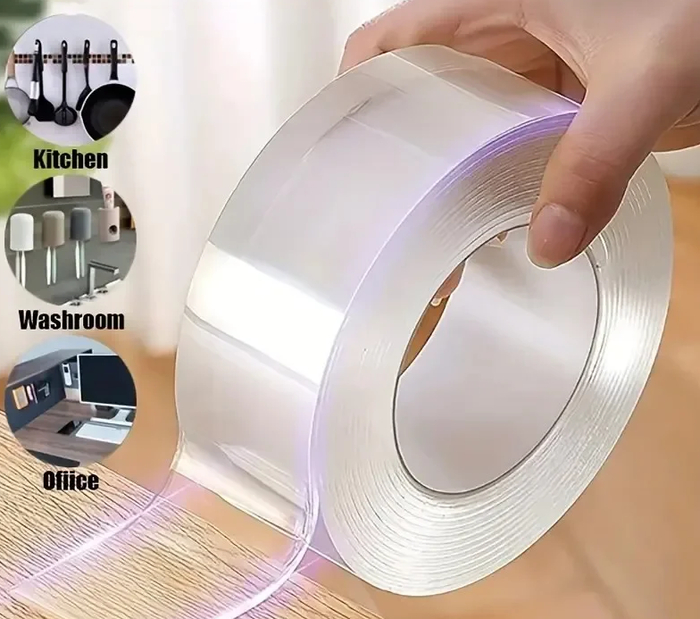 Клейкая лента обеспечивает надежную фиксацию предметов без сверления. Прозрачная структура делает крепление незаметным. Многоразовое использование повышает практичность. Подходит для дома и организации пространства.