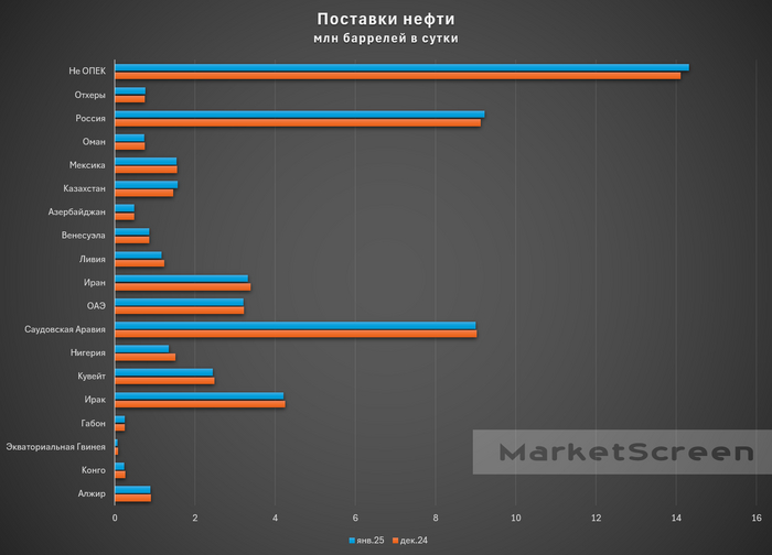 Для удобства структурировал данные в два графика. Первый – это средние ежемесячные поставки в декабре 2024 и январе 2025. Второй – доли.