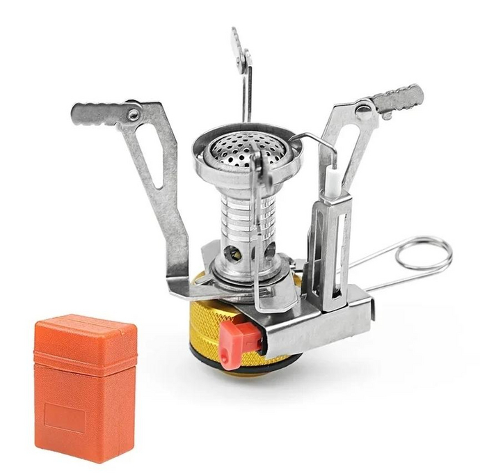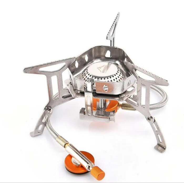 Это на мой взгляд отличный вариант недорогой и мощной складной горелки. В конструкции сразу предусмотрен переходник для стандартного баллона. Размер горелки в транспортировочном чехле составляет 55*37*35 мм, при этом горелка имеет вес 110 грамм. Заявленная максимальная мощность устройства составляет 3000W, что, как по мне, очень много для таких размеров горелки. Устройство оснащено регулятором пламени, а также автоматическим поджигом.