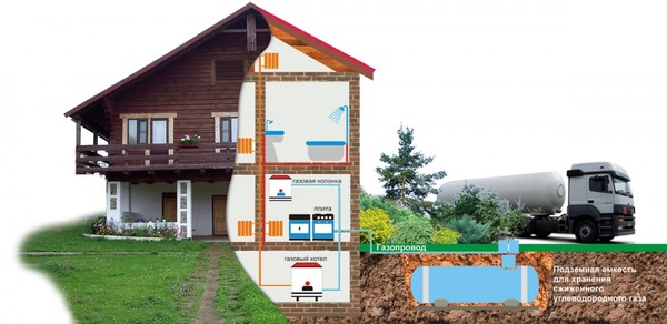 От горловины резервуара прокладывают газопровод, а от него уже делают отводы в котельную и на кухню. Газопровод прокладывается на глубине не меньше полутора метров, в траншее с песчаной подушкой. Специальный транспорт заполняет газгольдер сжиженным углеводородным газом (СУГ). Сжиженное топливо потом переходит в газообразное состояние. Газ проходит через специальные регуляторы и при пониженном давлении (30-50 миллибар) идет по газопроводу в котельную.
