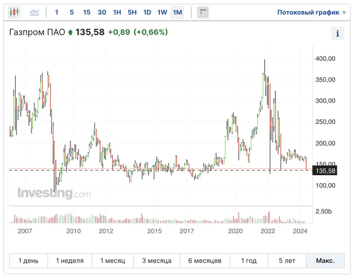 Если посмотреть с начала века, то Газпром исправно платил дивиденды каждый год с 2001 по 2022 год (да и в прошлом веке платились тоже). Но существенными дивиденды стали с 2012 года, когда стали платить по 4-5-6%. В 2019 и 2020 годах они даже составили 7-8%. В 2021 снова чуть больше 4%, а в 2022 году Газпром был выжат на 26,15%, что породило секту свидетелей гигантских дивидендов. Конечно же, выплате предшествовал трэшток от СД, пикирование котировок, потом были дивиденды, гэп, который Газпром так и не закрыл. В 2023 году дивидендов не было, в 2024 году их тоже не будет.