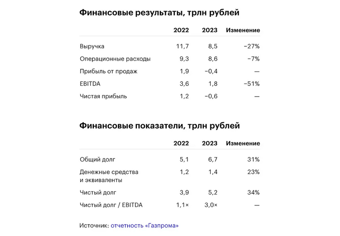 Ни для кого не новость, что Газпром завершил 2023 год с убытком. Вот основные показатели. Выручка составила 8,54 трлн (-26,8% г/г), EBITDA — 1,76 трлн (-51,5% г/г), Чистый убыток — 629 млрд (в 2022 году прибыль 1,23 трлн), Чистый долг — 5,2 трлн (+37% г/г), коэффициент Чистый долг/EBITDA — 2,96 (1,1 за 2022 год, CAPEX — 3,12 трлн (+9,7% г/г).