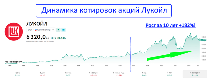 Историческая восходящая динамика котировок Лукойла почти столь же привлекательна, как и динамика дивидендных выплат - акции растут! За последние 10 лет бумага прибавила около +182% (без учёта дивидендов).
