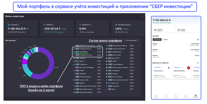 Например в моём портфеле Лукойл занимает 2 место после СБЕРа (скрин из сервиса учёта инвестиций и приложения СБЕР инвестиции):