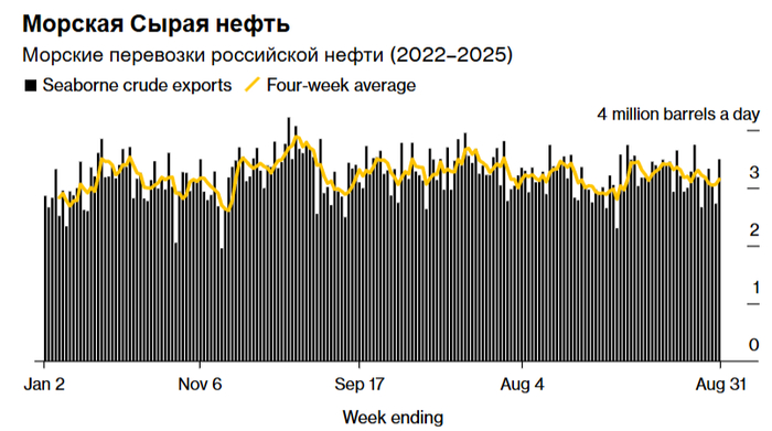 🗄 НДПИ (675,7₽ млрд vs. 634,1₽ млрд месяцем ранее). РФ в 2024 г. 6 месяцев не придерживалась плана сокращения, в начале 2025 г. происходила компенсация по добыче за ранее превышенные квоты, но начиная со II кв. РФ уже наращивает добычу. В августе 2025 г. добыла нефти — 9,173 млн б/с (+50 тыс. б/с м/м). В сентябре восьмёрка стран ОПЕК+ увеличили квоты на добычу в октябре, Россия в октябре сможет добывать 9,491 млн б/с. По состоянию на 31 августа общий объём поставок (за 4 недели) морского экспорта российской нефти составил 3,15 млн б/с.