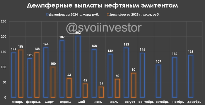 🗄 В августе Минфин выплатил компаниям по демпферу — 80,4₽ млрд (-50,8% г/г, в июле — 59,9₽ млрд). С учётом повышения цен на топливо (происходят атаки на НПЗ+сезонность, а это дефицит топлива из-за ремонтных работ), правительство установило полный запрет на поставки бензина за рубеж до конца октября. При этом правительство готовит изменение демпфера, чтобы нефтяные компании смогли поднять цены на топливо выше. Не забывайте, что демпферные выплаты необходимо нормировать на себестоимость нефти, чтобы учитывать их в прибыли нефтяников.