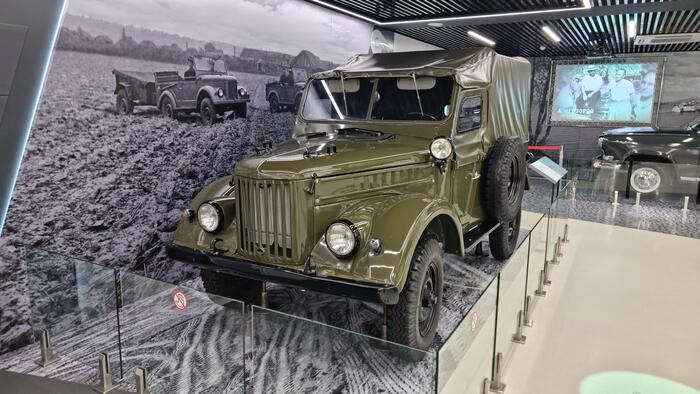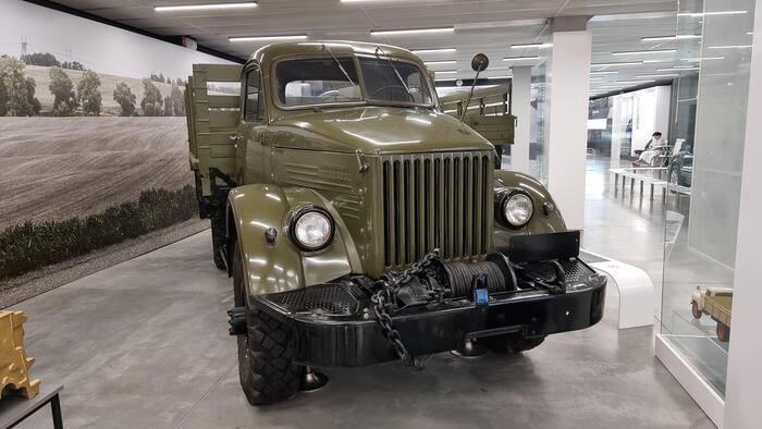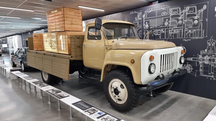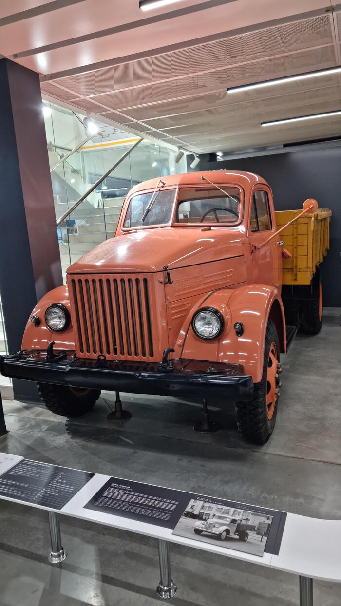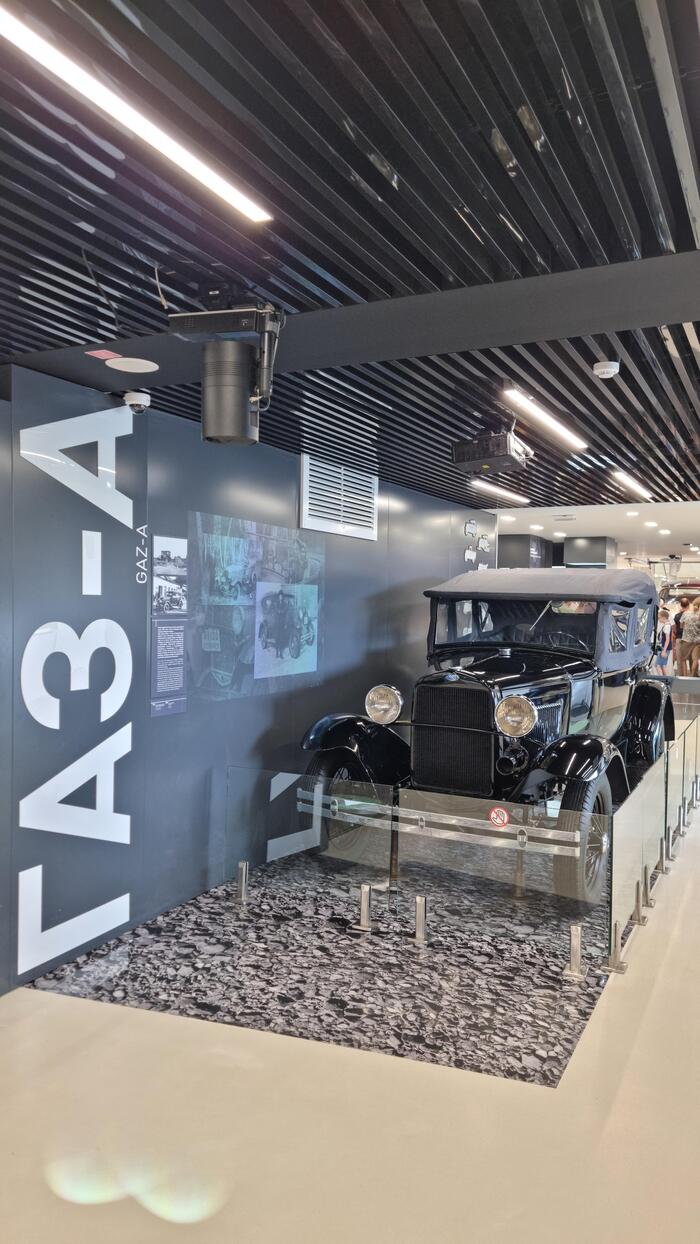 Далее, за стеклянными ограждениями, стояли автомобили, производившиеся на заводе, начиная с самых первых моделей. Внимание сразу привлёк легендарный грузовой автомобиль ГАЗ-АА, более известный как “полуторка”.