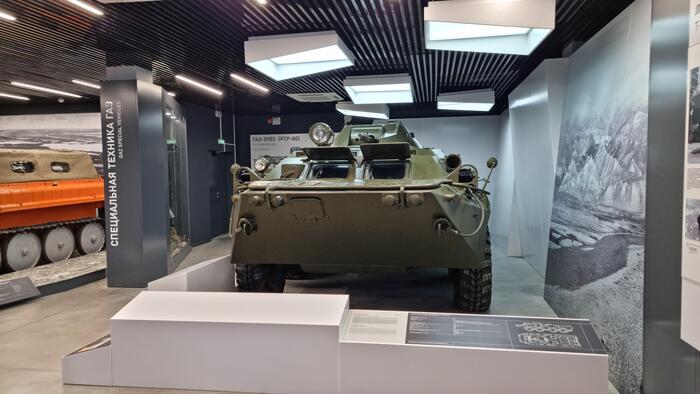 А в самом конце выставочного зала, огороженном лентой, разместилась спецтехника, в том числе грозный БТР-80