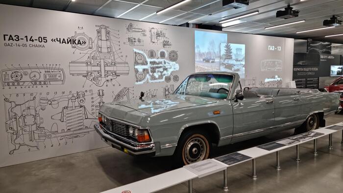 Почётное место в экспозиции, конечно же, занимала легендарная серия “Чайка” в нескольких своих ипостасях: тут были представлены и ГАЗ-13, и более поздний ГАЗ-14, и даже редкий кабриолет ГАЗ-14-05. Настоящая вершина советского автопрома!