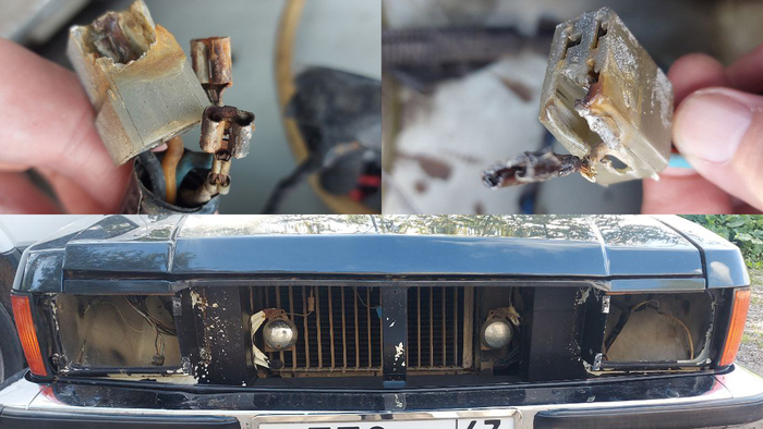 Предвкушая будущие, поездки подвожу мастера до гаража и уже на подъезде слышу характерный щелчок из блока предохраниетелей, после которого гаснут фары. Лезу в общий блок, нахожу почему-то выбитый предохранитель, ну мало ли, ставлю новый, прощаюсь, завожусь, включаю фары и снова щелчок. И снова фары гаснут. Чтож, снова лезем под капот. После осмотра оказывается, что коннекторы мягко говоря пришли в негодность и требуют замены здесь и сейчас. Так же требуют замены разъемы на корпусе самих фар. Приходится снимать обе фары, а для этого нужно снять решётку радиатора, пластик фары, стекло фары и уже после этого можно спокойно открутить саму фару. Фары снимаются, жду следующий день, чтобы начали работать магазины, в которых можно купить разъемы на замену. Без решетки и фар машина выглядит жутковато.