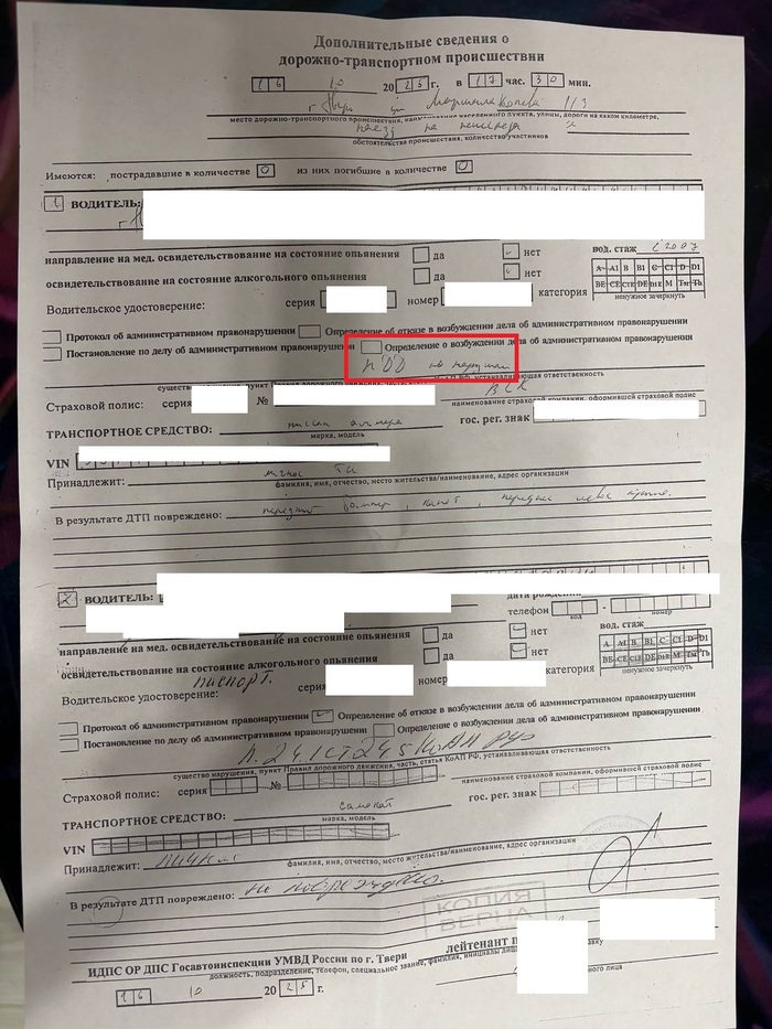Попытки цепляться даже к следам жидкости (гибдд сказали что это тек кондиционер их машины и показал что под уклоном как раз текло выше ). Мол нет следов экстренного торможения родственницы (а зачем оно должно понадобиться вообще, если с их слов маневр был безопасным и не создавал помехи пострадавшей стороне). И привязывались к положению авто после остановки. Мол это родственница завиляла и в нас въехала с правой части бампера и задела крыло. И опять ходатайство о проведении трассологии.