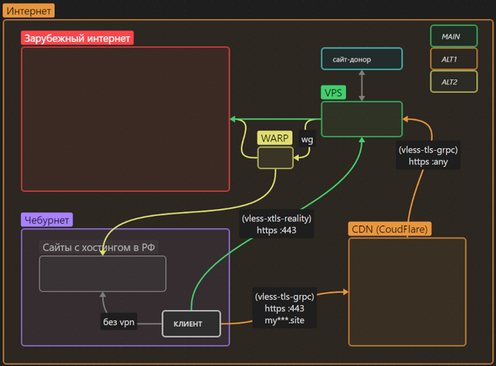 При выполнении этих условий (в текущих реалиях) сервер невозможно вычислить и заблокировать. Однако, я люблю избыточную надёжность, поэтому... на случай неожиданной блокировки VPS-сервера по IP — есть «План Б»: проксирование трафика через CDN (Content Delivery Network). CDN созданы для балансировки трафика крупных сайтов, состоят из сотен IP-адресов, поэтому шанс их блокировки в РФ минимальный. Я использую одну из самых крупных CDN в мире — CloudFlare с бесплатным тарифом. Именно к CloudFlare вы привяжете купленный домен, чтобы пускать трафик через него. Проксирование через CDN чуть медленнее прямого коннекта к серверу. Зато, при использовании CDN, РосКомНадзор вообще не узнает IP вашего сервера.