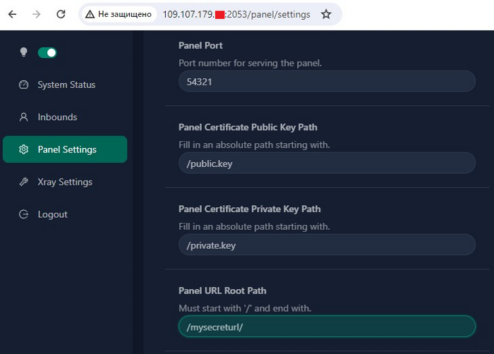 Шаг 5: Войдите в панель ещё раз с новым логином и паролем. Теперь панель будет всегда доступна по HTTPS адресу вида: https://111.111.111.111:54321/mysecreturl/ (где IP, Порт и Путь будут вашими собственными).
