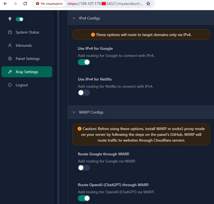 Шаг 2: Пустите весь российский трафик на сервере через WARP. Для этого перейдите в раздел "Xray Settings"->"Routing Rules", найдите строку где написано " geosite:openai " и отредактируйте её, чтобы получилось: geosite:category-govru, regexp:.*\.ru$,geosite:openai