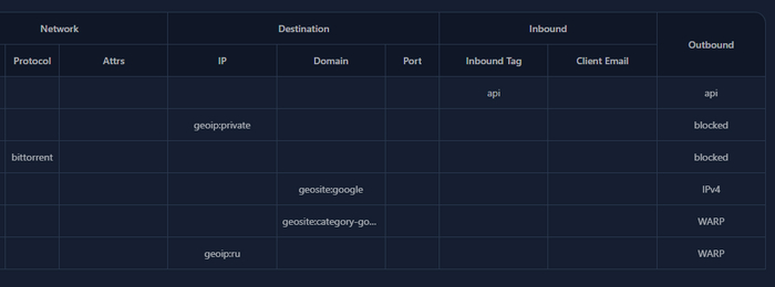 Наконец, добавьте новое правило через кнопку Add Rule (IP: geoip:ru , Outbound tag: WARP ) как на скриншоте.