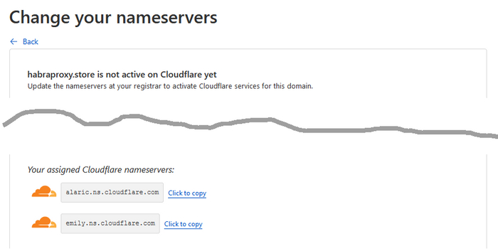 Шаг 3: Зайдите в CloudFlare, в верхнем разделе "Websites" добавьте ещё не купленное доменное имя. Далее - Тариф Free - Continue... пока наконец вы не попадёте на страницу "Change your nameservers" с двумя оранжевыми облаками.