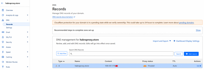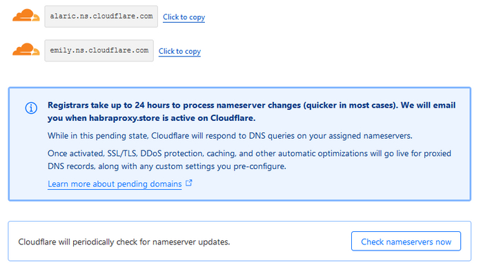 Шаг 9: Вернитесь на (Overview), и если под оранжевыми облаками найдёте кнопку "Check nameservers now" - нажмите её, чтобы поторопить систему.